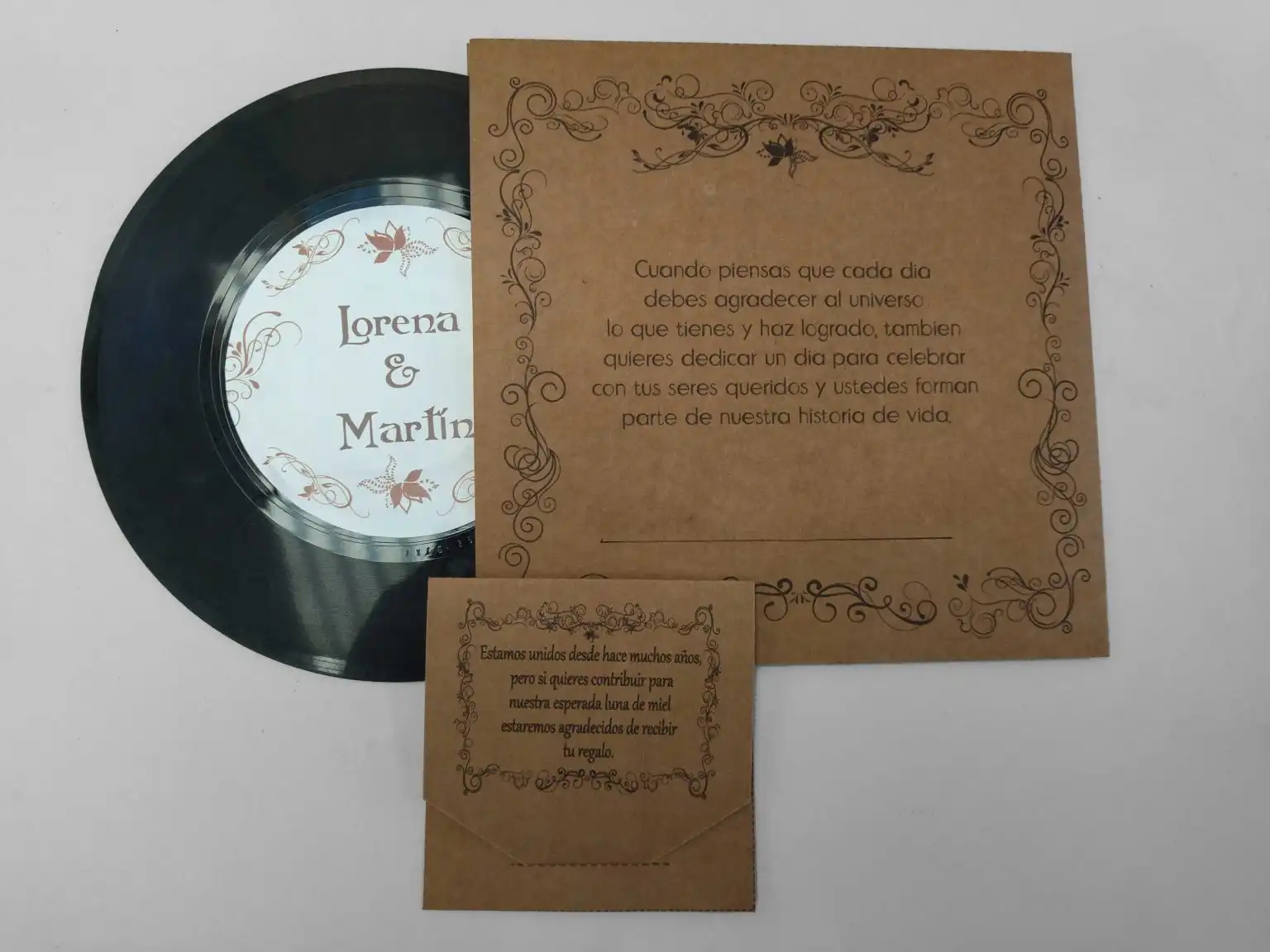 Sobre de vinilo Diseño de sobres de vinilo incluye sticker de etiqueta correspondiente a cada disco, el sobre es de papel kraft , con motivo personalizado para parte de matrimonio.